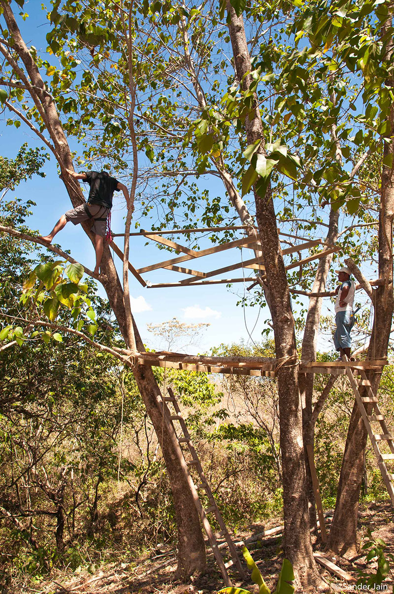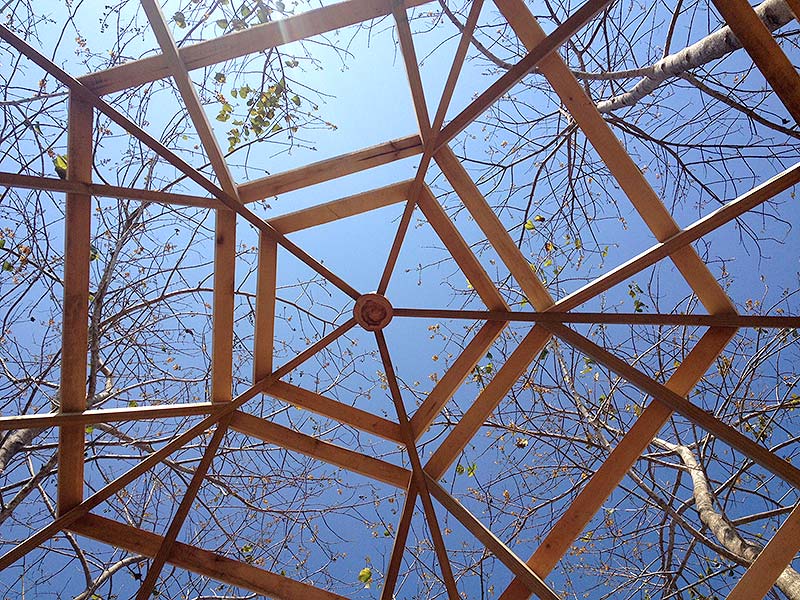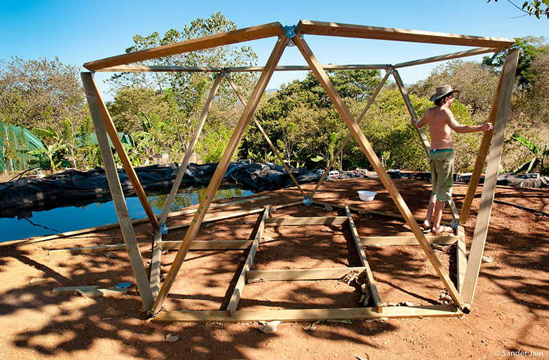 It’s assembled using all materials purchased here locally in Costa Rica, except for these plates that come in a kit for this purpose: Icosahedron Dome Plates. You only get 11 plates because when you make the structure on the ground you don’t do the bottom point, the 12th vertex. In order to get around this Joseph created a custom point at the top to complete the sacred shape.
