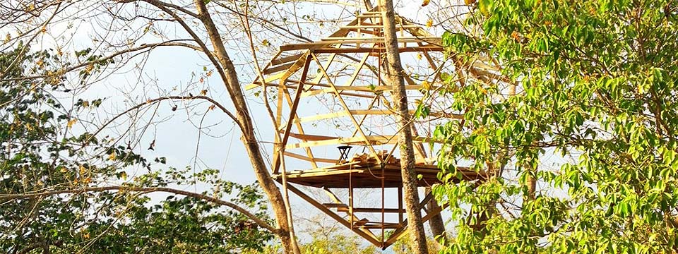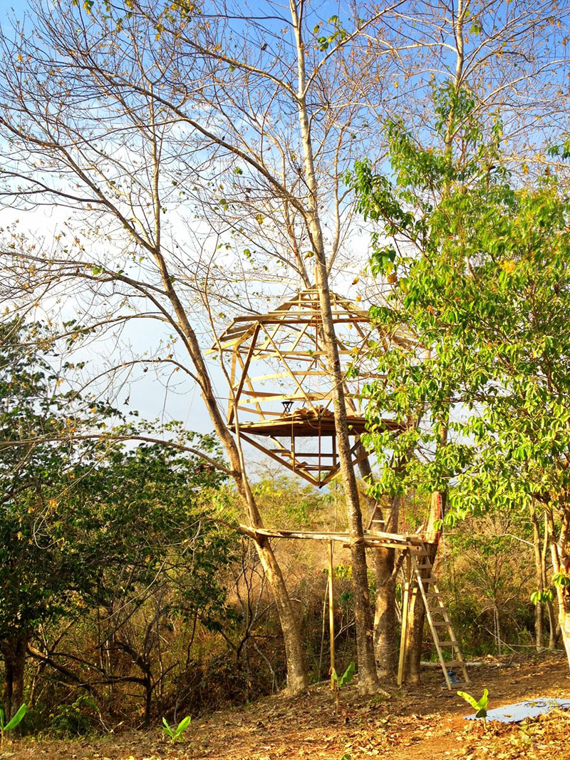Joseph had initially thought to build this sacred geometry structure on the ground, but then when checking out the tree’s in the area. These 4 lovely Malinia trees in a circle called out to him. One branched out in such a way that made a perfect 5 sided chalice if you will. A perfect holding spot for this structure with a pentagon shaped floor.