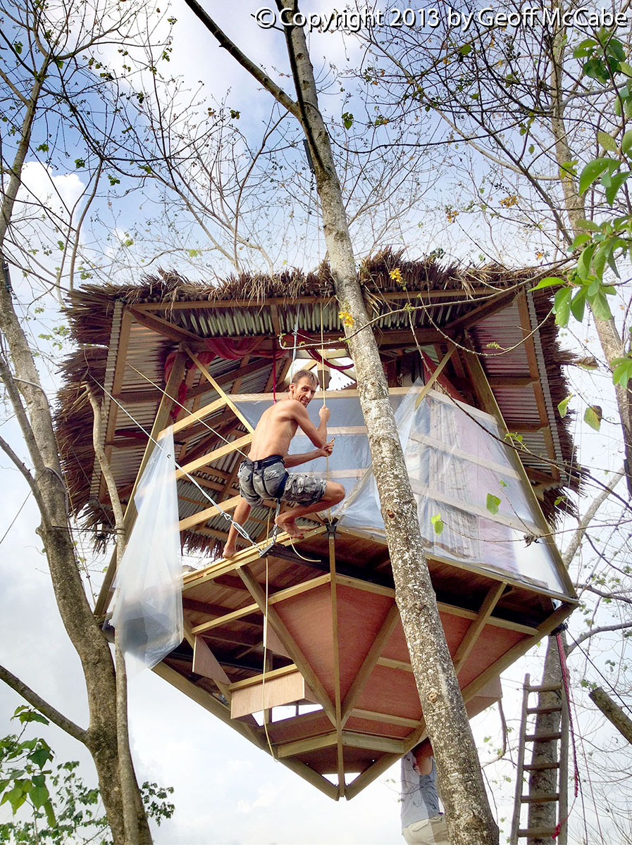 The first structure, what’s now the bedroom is actually suspended on cables between these 5 main strong trunks. The shape is called an Icosahedron. Which is one of the 5 platonic solids. It’s made up of 20 equilateral triangles that meet at 12 points or vertices that roughly make a spherical shape.