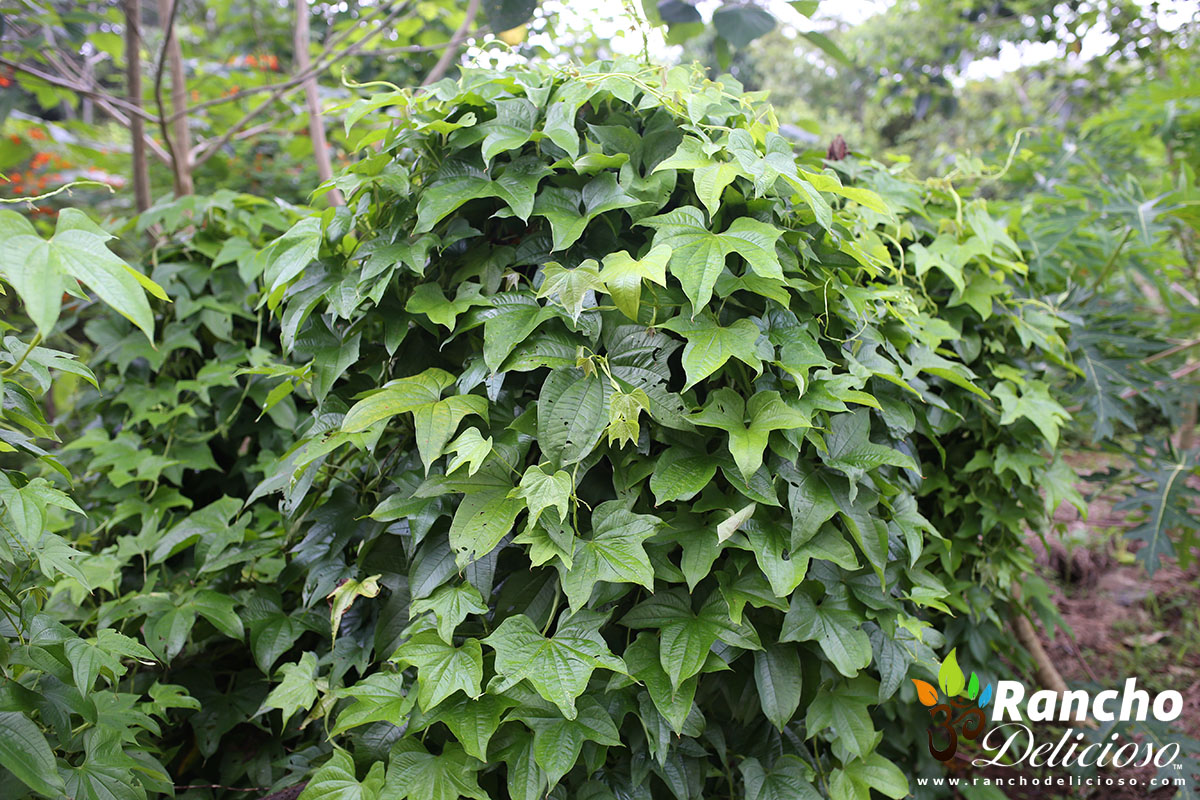 Malabar spinach grows easily here in the tropical climate, producing a large quantity of edible leaves. The vines grow only 2-3 meters long before the plants die out, but it’s easily regrown from its own seeds. It’s dark purple berries can also be used as a dye. The leaves are “Mucilaginous” meaning that they’re slimy. So like Okra, they take special knowledge of how to prepare them to reduce the slime factor.