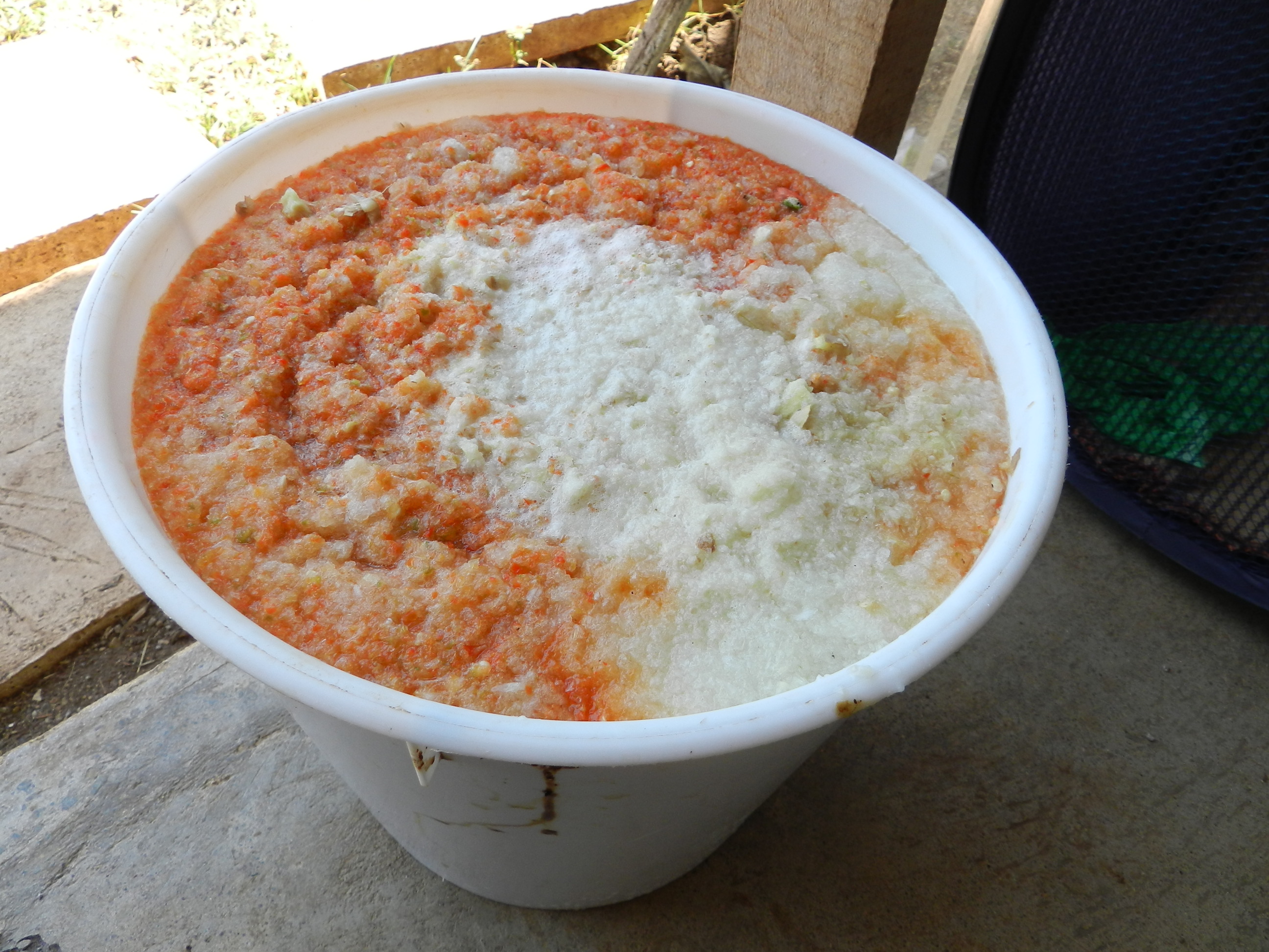 Chop the garlic, onion, ginger, hot pepper and the herbs, and then blend everything together. Next we add the molasses, the vinegar, the alcohol and the microorganisms. We add water to complete the 120 litres. We cover the mix and leave it rest for 15 days. After that, it will be ready to use, but we have to be careful and apply little quantities on the plants first for a trial. If it is too strong, then we can add more water.