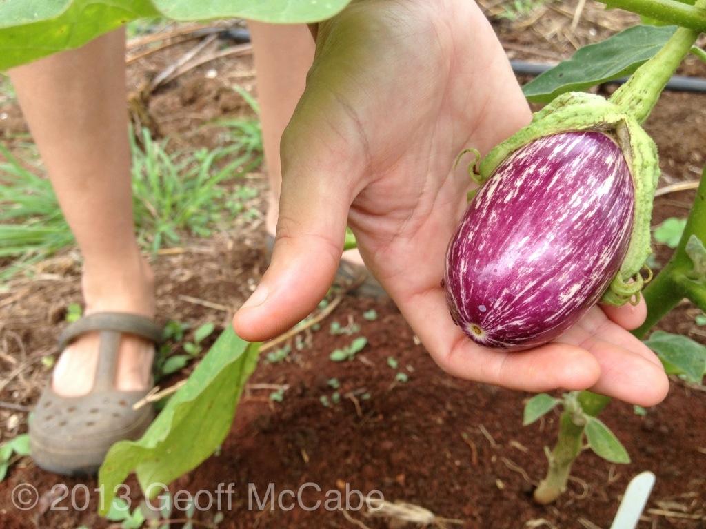 These beautiful eggplants are our first ones besides the long yellow ones. They are small now, around 2 1/2 inches, but growing quickly, and we’re excited to see how big they get, and how many each bush will produce.