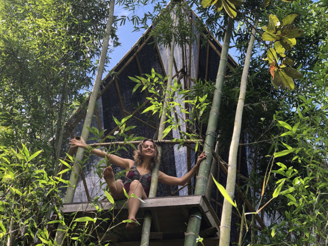 Living Bamboo Tree House Tower – Up to 5 people: 1 queen bed and 3 single beds with full kitchen and bathroom. Airbnb booking.