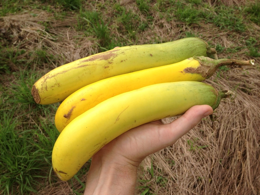 The yellow banana-like eggplants shown here grow very easily on meter-high bushes the continue to produce for many months.